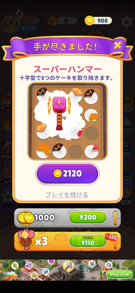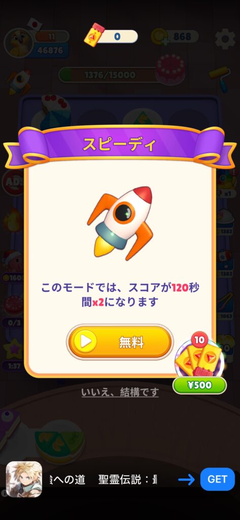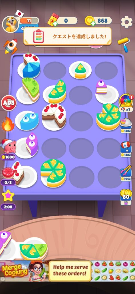 広告はプレイ中に休息として強制的に表示されるものと、ケーキ並べが詰まったときに役に立つアイテムを得るために自発的に視聴する広告があります
