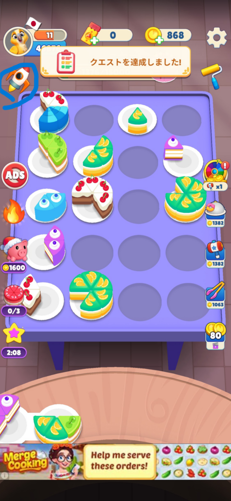 このロケットブーストある程度テーブルのケーキが完成しそうな状態にしておいてから、ブーストをかけて一気にケーキを完成させていくと効率よく経験値を得ることができます