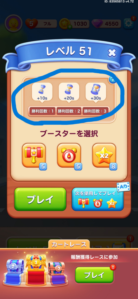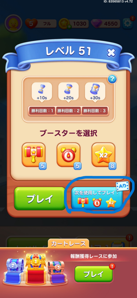 このゲームは強制的な広告はありませんが、ステージを有利に進めるためのブースターと呼ばれるアイテムを入手する際に広告視聴が必要になってきます。