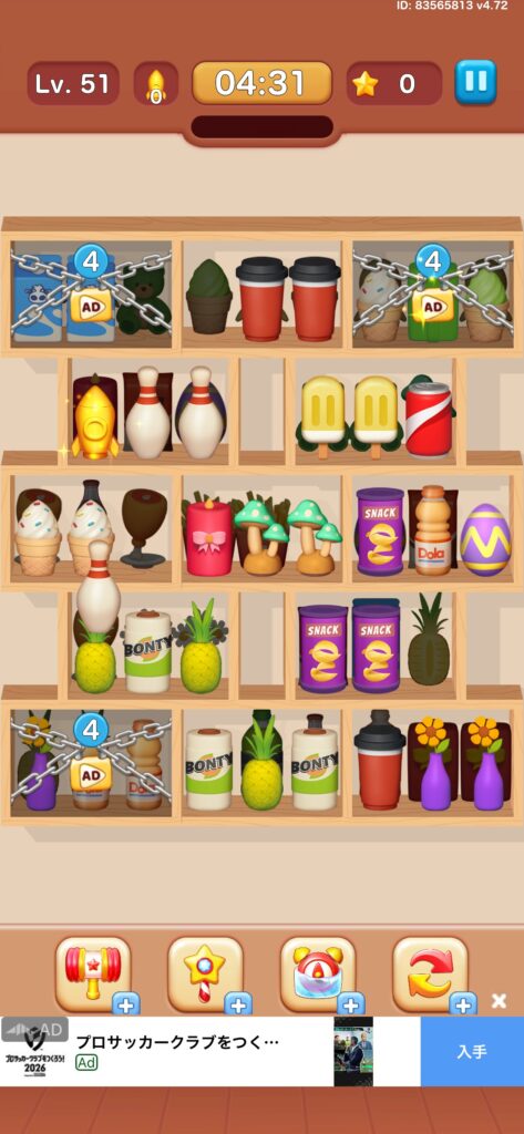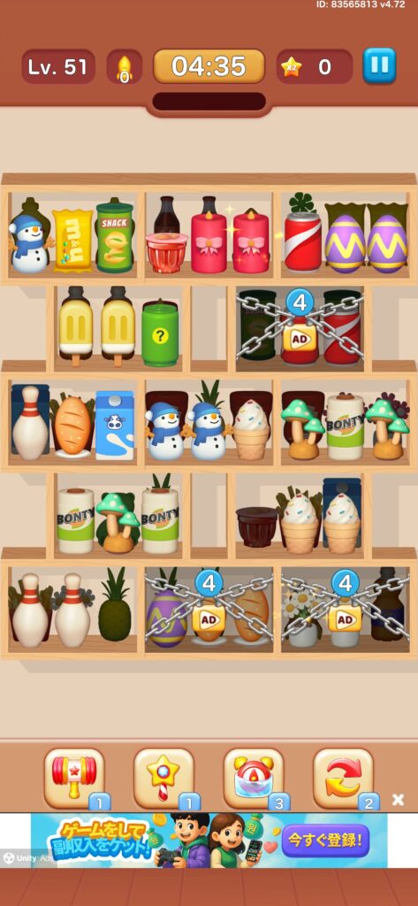 最初のうちはアイテムなしでもステージクリアできますが、ステージレベルが上がるにつれ難易度も上がっていきますので詰まってきたら積極的に広告アイテムを活用していってください。