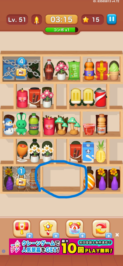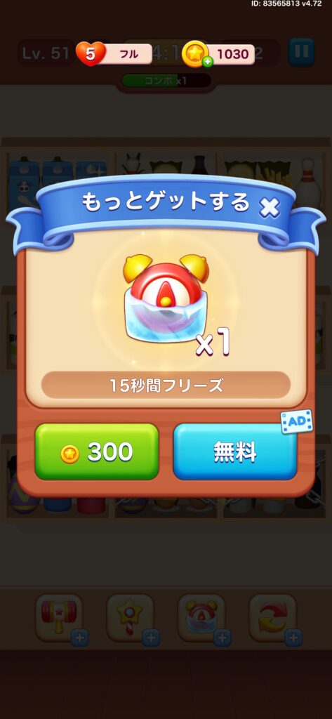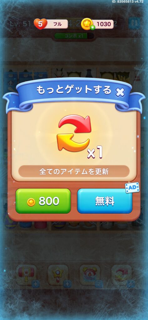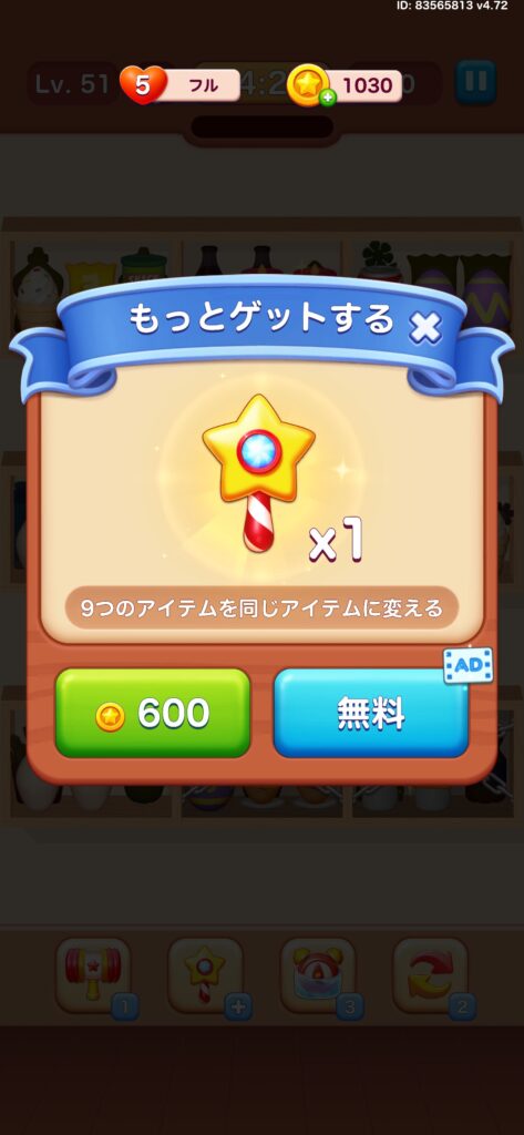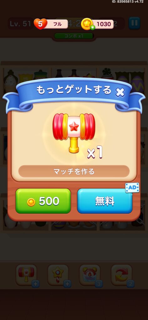 広告視聴で手に入るアイテムは一組商品を強制的に排除できるハンマー、プレイ時間を延ばすことができる時計、クリア時に貰えるコインが2倍になるスターがあります。