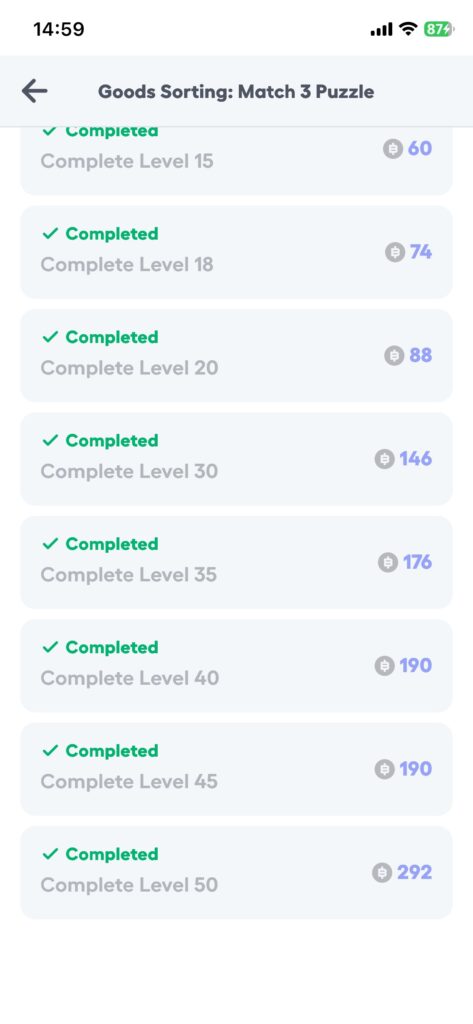 このゲームを紹介しているZBDでは2倍期間中でレベル50達成で1470サトシが貰えるというものでした。